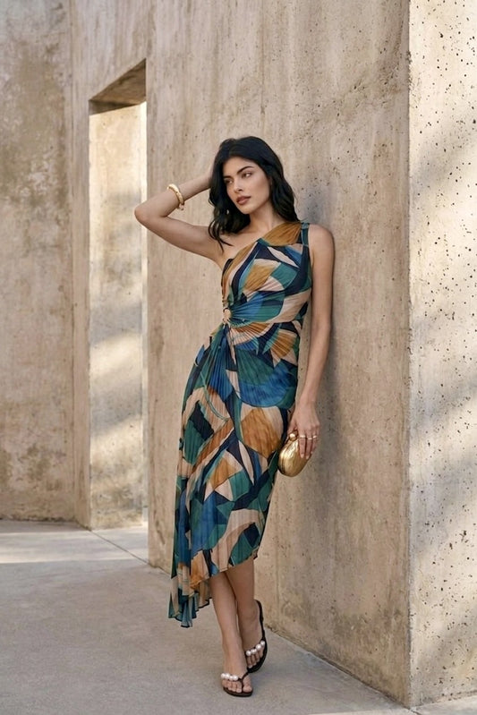 The Prism Palm Asymmetrical Pleated Dress
