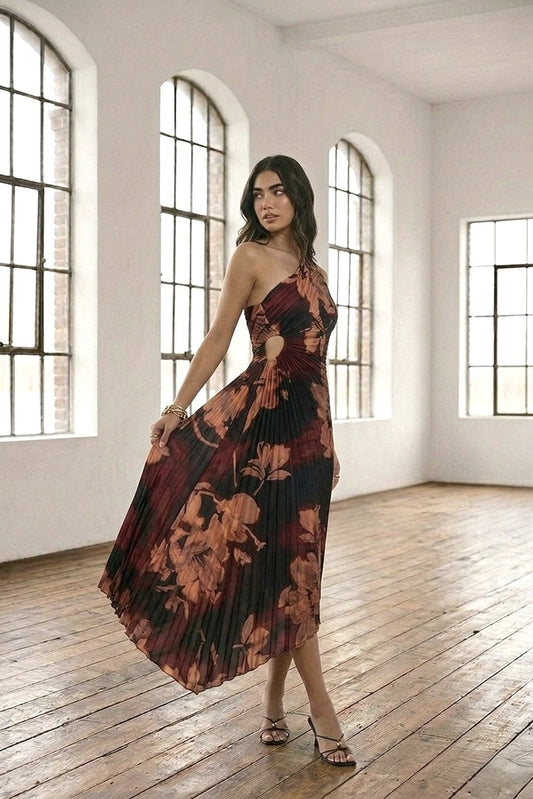 Introducing The Somerset Drift—a botanical reverie in motion. This asymmetrical pleated maxi dress captures the...