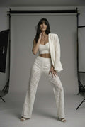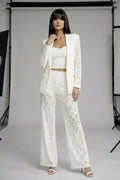 The White Theory 01 Lace Pant is a bridal essential from The Vow Collection. Crafted in delicate lace, these high-rise wide-leg pants feature a hidden side zipper and semi-sheer construction that balances elegance with modern sophistication. The flowing silhouette drapes beautifully, creating movement and grace with every step. Designed to pair seamlessly with The White Theory 01 Lace Jacket for a complete bridal look, these pants also stand alone for rehearsal dinners, engagement celebrations, and intimate wedding moments. The refined lace detailing and clean lines embody timeless bridal aesthetics while maintaining a contemporary edge. Perfect for the modern bride seeking understated luxury and versatile styling options.